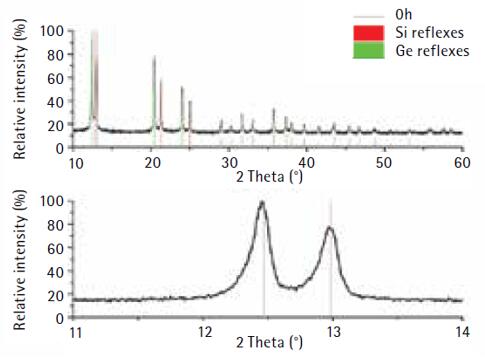 圖1:研磨前樣品XRD 分析結果 Si(紅)Ge(綠)整個掃描范圍從10-60°,可以看出Si和Ge晶面特征峰。