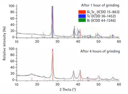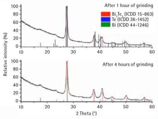 在經過近1小時機械合金研磨,Bi和Te的特征峰都有明顯可辨的偏移,顯示化合物Bi2Te3開始形成。球料比10:1的樣品形成速度比5:1的更快,因為5:1樣品中Te的特征峰值強度更大,說明10:1樣品中的Te反應地更多。合金反應繼續1200轉/分3小時后,沒有樣品結塊。