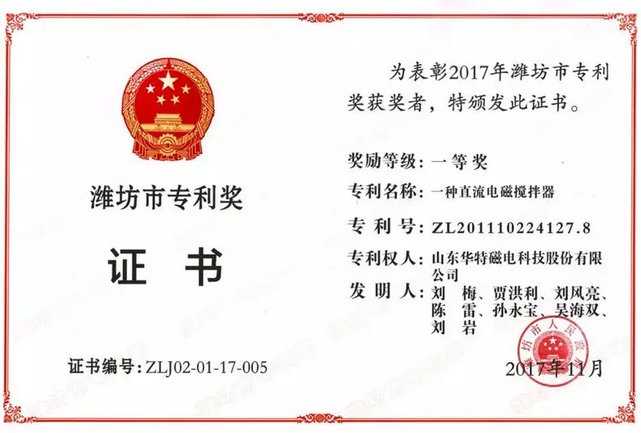山東華特磁電科技股份有限公司發明專利“一種直流電磁攪拌器”榮獲2017年度濰坊市專利獎一等獎,這是公司貫徹執行國家知識產權戰略,將知識產權作為科技創新重要內容,強化成果轉化,提升經濟效益的又一重大體現。