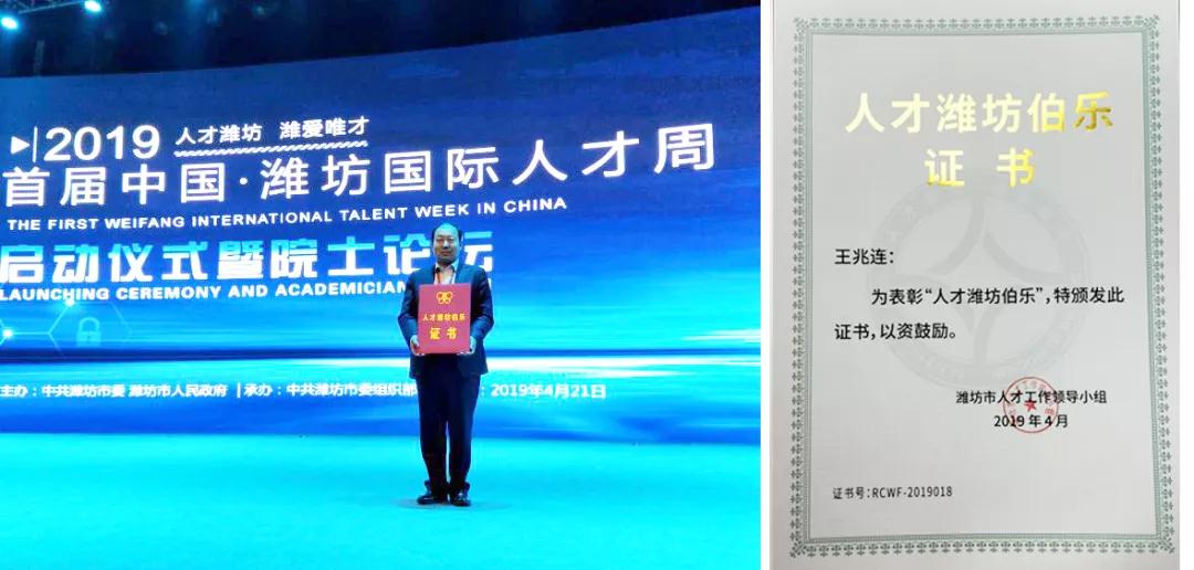 活動期間,惠新安書記和省委組織部劉樹軍副部長為獲獎企業(yè)家頒發(fā)了首屆中國?濰坊國際人才創(chuàng)業(yè)大賽和人才伯樂獎。王兆連董事長喜獲“人才濰坊伯樂”獎。