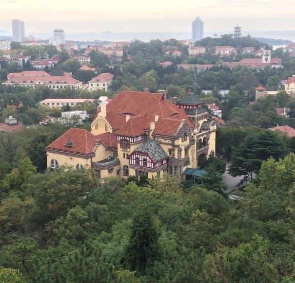 隨后,驅車十多分便到達信號山公園,位于青島市中心,因曾在山頂建有為船只引航的信號臺而得名。信號山海拔98米,山頂三幢紅頂蘑菇樓尤為顯眼,其中最高的一幢是旋轉觀景樓,在這里可以360度俯看青島“紅瓦綠樹,碧海藍天”,市區景色美不勝收。