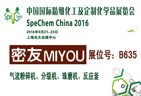 密友集團攜旗下粉體裝備制造及化工機械參加此展,展位號:B635,歡迎屆時蒞臨!屆時密友將展示新一代深冷超細粉碎高分子材料氣流粉碎機、惰性氣體保護氣流粉碎機、新一代高精微米分級機、納米砂磨機等粉體設備及高壓反應釜、攪拌分散釜等化機產品。