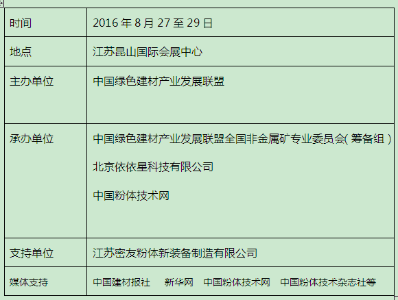2016中國非金屬礦產(chǎn)業(yè)技術(shù)研討會(huì)于8月27至29日在江蘇昆山國際會(huì)展中心盛大召開。此次研討會(huì)由中國綠色建材產(chǎn)業(yè)發(fā)展聯(lián)盟主辦,中國綠色建材產(chǎn)業(yè)發(fā)展聯(lián)盟全國非金屬礦專業(yè)委員會(huì)(籌備組)、北京依依星科技有限公司、中國粉體技術(shù)網(wǎng)承辦,中國建材報(bào)社、新華網(wǎng)、中國粉體技術(shù)網(wǎng)等多家媒體支持。