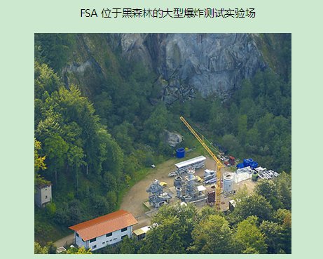在火災與爆炸防護方面,FSA有一個位于曼海姆的實驗中心和一個位于黑森林的大型爆炸測試實驗場。實驗中心對各種粉塵測試樣本進行化學,物理及燃燒爆炸特性的測試,主要測試內容包括:粉塵可燃性及燃燒行為測試,最低點火溫度,堆積粉塵自燃,粉塵最小點火能,粉塵最低點火濃度,粉塵最大爆炸壓力及壓力上升梯度等。位于黑森林的大型爆炸測試實驗場工作包括:大型爆炸實驗,基礎科學研究,防爆設備及系統的測試與認證。
