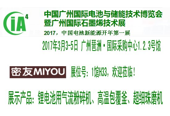 CIAAA2017中國廣州國際電池與儲能技術博覽會將于2017年3月3—5日于廣州琶洲·國際采購中心舉行,近600家電池企業將盛裝亮相電池技術交流會。密友集團旗下粉體裝備制造將參展,在1館H33展位展示鋰電池用氣流粉碎機、高溫包覆釜、超細珠磨機等產品。