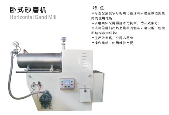 臥式砂磨機適用于農(nóng)藥等行業(yè)的物料研磨,能將物料顆粒的聚體化,通過強力的研磨短時間內(nèi)達到要求的細度。操作使用簡單,可靠性好,生產(chǎn)效率高。
