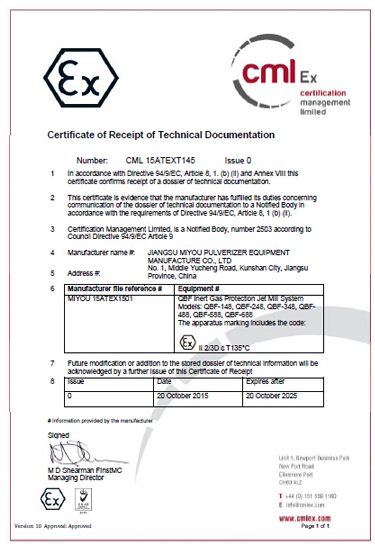 密友公司氣流粉碎機榮獲ATEX歐洲防爆認證,是中國化工行業第一家擁有此認證的企業。至此,密友設備對于滿足超細粉體安全生產的要求已達到歐洲標準。密友以30年化工行業設備制造經驗,為客戶提供成套設備整體解決方案!