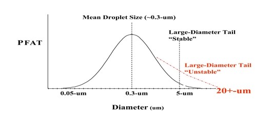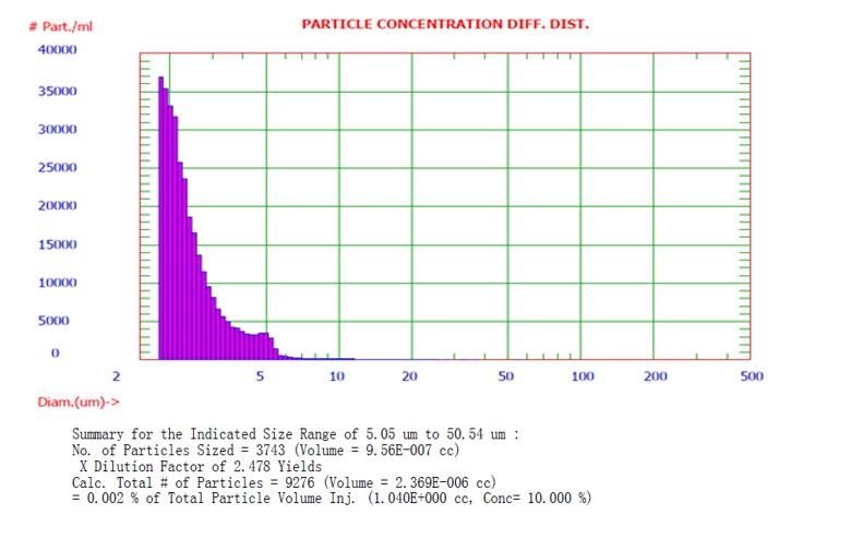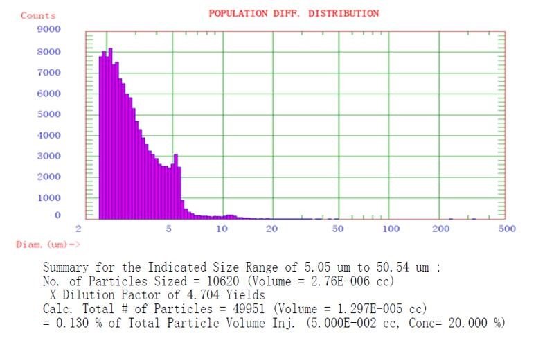 PFAT5值是指大顆粒尾部(Large-Diameter Tail)分布規定,其待測樣品中顆粒的體積粒徑值(X)在5μm<X <50μm之間的比例占總的所測體積徑的百分比要小于0.05%。
