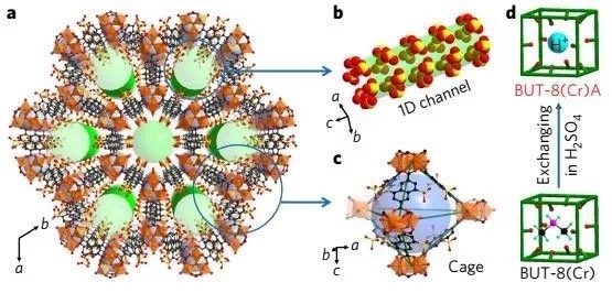 研究人員利用硫酸對預先合成的BUT-8(Cr)材料進行后處理修飾,處理后的MOF材料取名為BUT-8(Cr)A,是一種具有一維孔道的三維框架結(jié)構(gòu)。其特點在于,一維孔道表面具有豐富的磺酸基位點(-SO3H),極大地促進了質(zhì)子傳遞。
