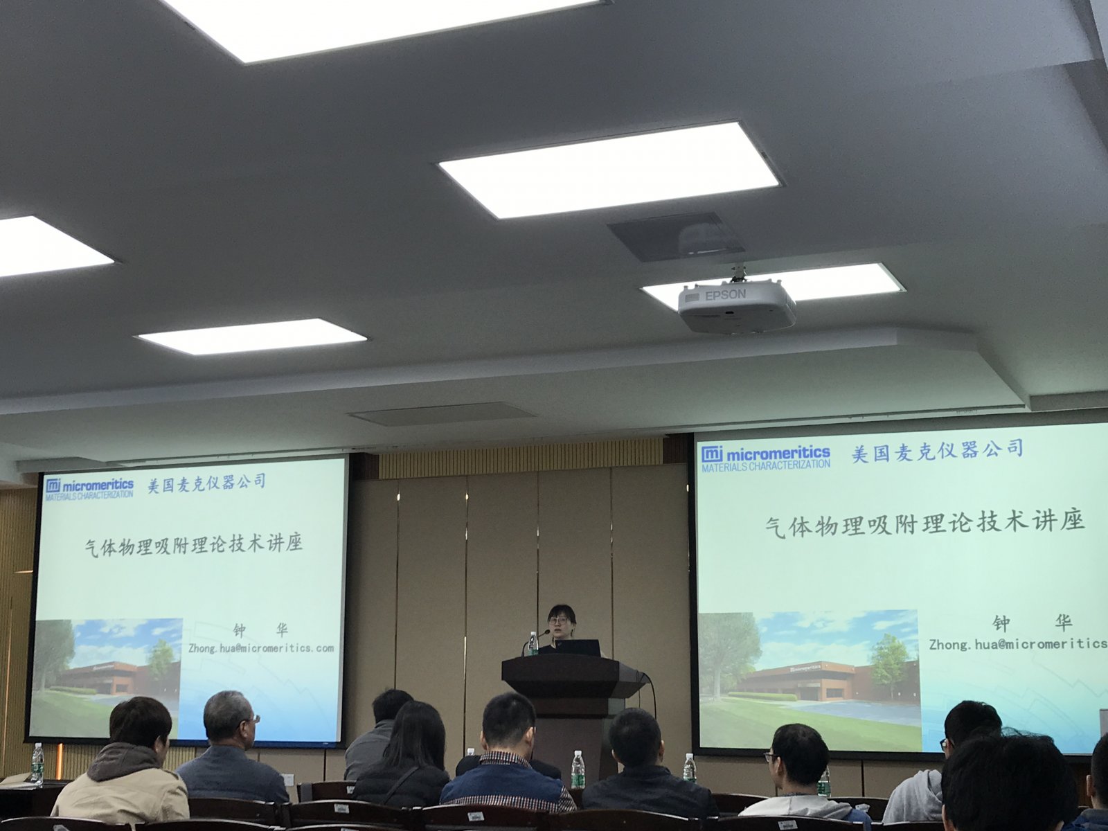 此次技術講座由美國麥克儀器公司市場應用部經理鐘華博士主講,她首先通過一幅幅生動形象的圖片,深入淺出地介紹了物理吸附的一些基本理論和應用知識,隨后針對應用過程中一些常見的問題做出了講解。在座同學認真聆聽并踴躍舉手提問,鐘華博士一一為大家答疑解惑。同學們學習了很多有關氣體物理吸附的專業知識,感到收獲頗豐,老師和同學們也希望今后繼續舉辦此類技術講座。