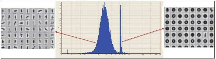 除了能夠測量顆粒大小和形狀,圖像分析系統也可以測量濃度。這些系統可以分析被捕獲的顆粒,同時,他們也可以對顆粒計數,提供一個顆粒濃度參數。此外,如果樣品中含有大量各種形狀的顆粒,大多數圖像分析系統都可以在軟件-計算形狀參數的基礎上定出一個分析樣品的數量。在圖2上的直方圖中顯示的是兩個完全不相同的樣品峰。圖像分析系統可以讓用戶選擇性的查看創建每個直方圖 峰值的實際顆粒的分析結果。
