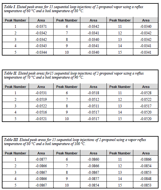 匯總數據見表四。三組不同溫度下重復進樣的積分峰面積的標準偏差均低于1%。實際蒸汽的進樣體積與由異丙醇蒸汽壓而得的預測值比較吻合。