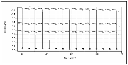 圖1. 三個不同回流帶溫度下連續15次注入異丙醇蒸汽的時間與TCD信號輸出圖;(a)60 ℃(b)70 ℃(c)80 ℃。