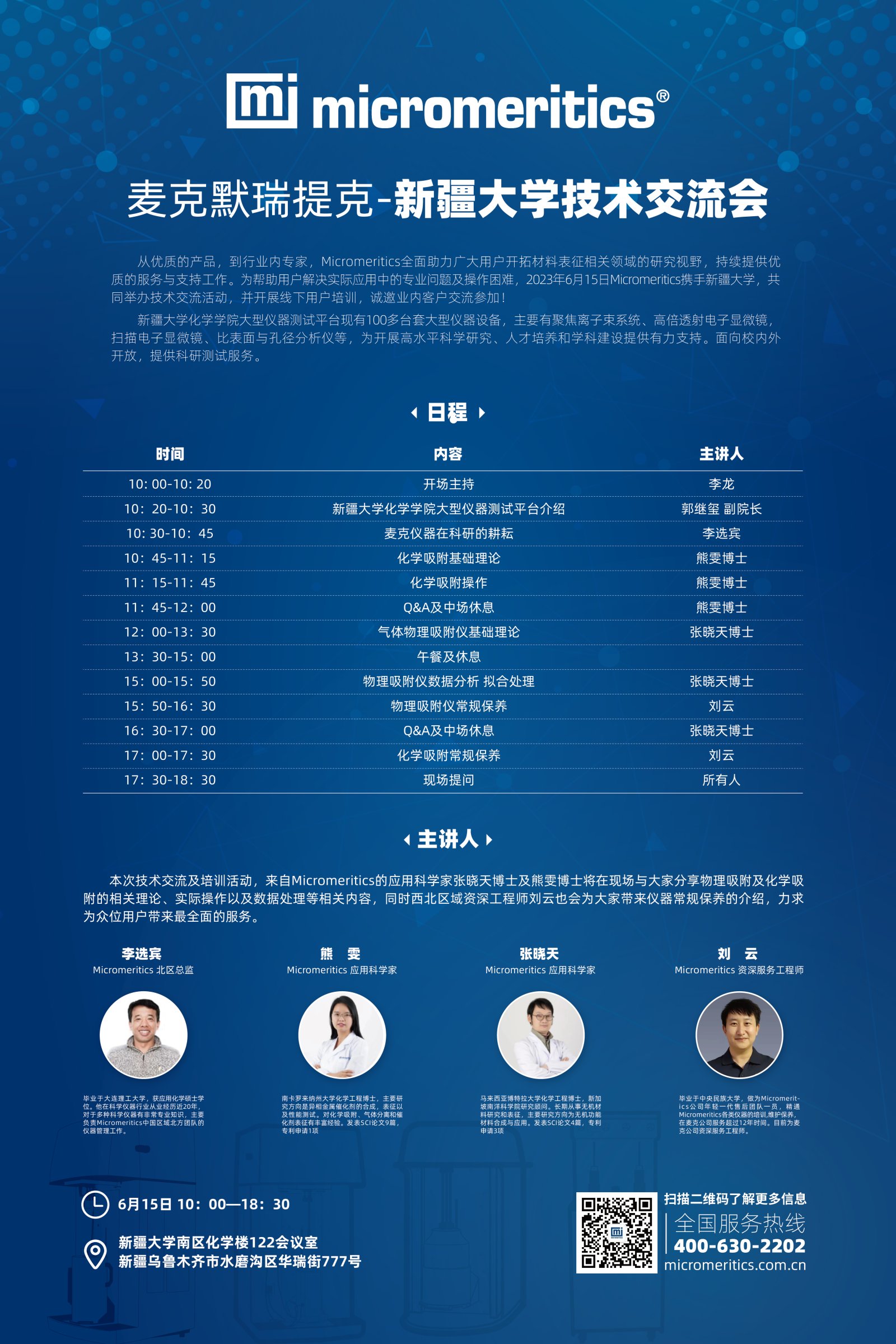 從優質的產品,到行業內專家,Micromeritics全面助力廣大用戶開拓材料表征相關領域的研究視野,持續提供優質的服務與支持工作。為幫助用戶解決實際應用中的專業問題及操作困難,2023年6月15日Micromeritics攜手新疆大學,共同舉辦技術交流活動,并開展線下用戶培訓,誠邀業內客戶交流參加!
