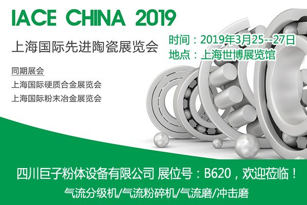 IACE CHINA 2019第十二屆上海國際先進(jìn)陶瓷展覽會(huì)暨會(huì)議3月25~27日在上海世博展覽館舉行。展會(huì)吸引了來自20個(gè)國家、地區(qū)的400多家優(yōu)秀企業(yè)參展,展覽面積超過25,000平方米。第十二屆上海國際粉末冶金展覽會(huì)暨會(huì)議、第十二屆上海國際硬質(zhì)合金展覽會(huì)暨會(huì)議也將同期舉行。四川巨子粉體設(shè)備有限公司作為超微粉體設(shè)備制造商應(yīng)邀參加,陶瓷色料粉碎機(jī)等產(chǎn)品屆時(shí)亮相。