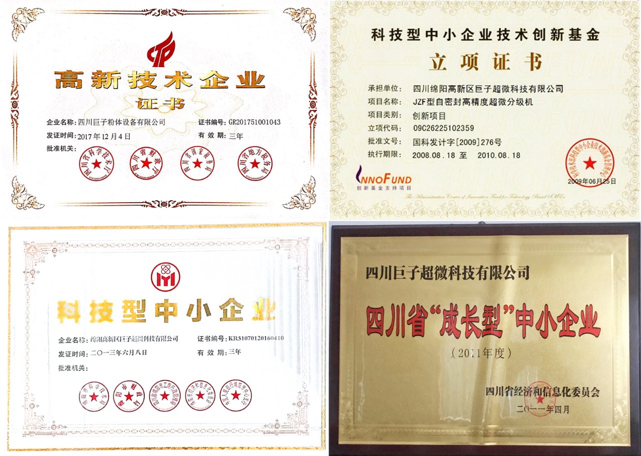 在20年來(lái)的發(fā)展歷程中巨子公司形成了獨(dú)具特色的研發(fā)、銷售、生產(chǎn)及售后服務(wù)體系,在企業(yè)經(jīng)營(yíng)、技術(shù)研發(fā)、文化建設(shè)和可持續(xù)發(fā)展方面成績(jī)斐然。公司于2008年順利通過(guò)ISO9000質(zhì)量體系認(rèn)證,現(xiàn)有的各系列粉碎分級(jí)設(shè)備能應(yīng)用于多種領(lǐng)域,可提供上萬(wàn)種粉體系統(tǒng)工程解決方案;實(shí)現(xiàn)了行業(yè)的重大突破,為前沿科研用于民用開(kāi)發(fā)探索出了一條新路徑。公司以技術(shù)起家,從2006年家被認(rèn)定為國(guó)家高新技術(shù)企業(yè)后連續(xù)順利通過(guò)高企復(fù)審,并被認(rèn)定為省市兩級(jí)知識(shí)產(chǎn)權(quán)試點(diǎn)企業(yè)、綿陽(yáng)市重點(diǎn)知識(shí)產(chǎn)權(quán)保護(hù)單位、科技型中小企業(yè),2010年公司自主研發(fā)項(xiàng)目 “JZF型自密封高精度超微系列分級(jí)機(jī)”獲得了國(guó)家創(chuàng)新基金立項(xiàng)資助并順利通過(guò)驗(yàn)收。
