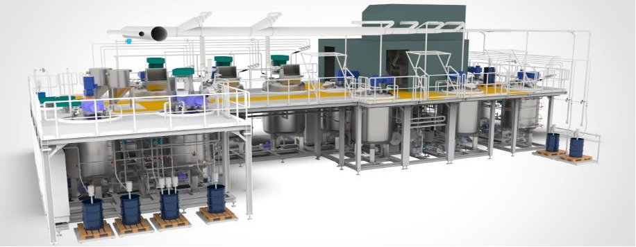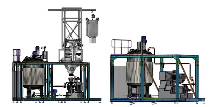 上圖顯示了兩個(gè)模塊。左邊的模塊由ψ-MIX在線混合系統(tǒng)和一個(gè)大袋進(jìn)料站組合而成,整個(gè)粉體進(jìn)料過(guò)程可以是密閉的,并配備精細(xì)除塵器。右邊的模塊為研磨裝置,由ZETA棒銷式研磨系統(tǒng)、儲(chǔ)料罐和泵組成。