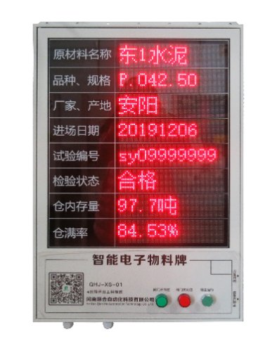 智能電子物料顯示牌用于顯示倉內原材料名稱、品種、規格、廠家、產地、進場日期、試驗編號、檢驗狀態、倉內存量、倉滿率等信息。
