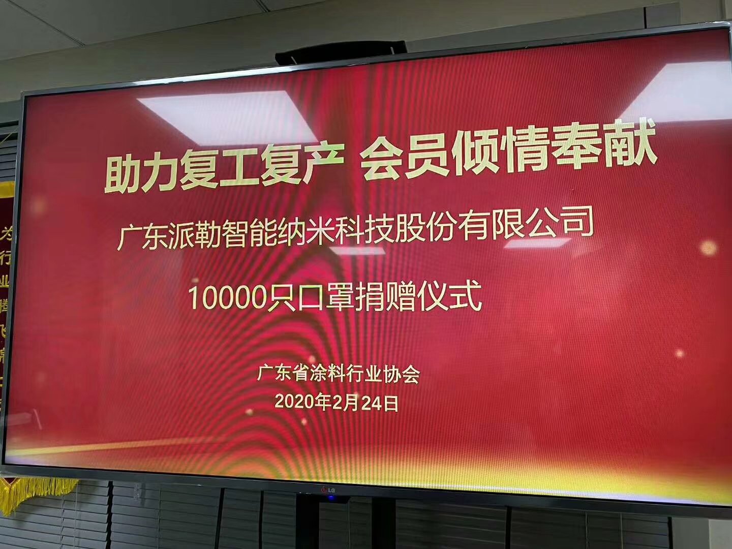 廣東派勒智能納米科技股份有限公司獲悉行業(yè)的需求與困難后,奔走四方,通過各種渠道為行業(yè)籌集口罩等緊缺物資,為行業(yè)復(fù)工復(fù)產(chǎn)貢獻(xiàn)力量。2月24日,派勒集團(tuán)通過廣東省涂料行業(yè)協(xié)會(huì),向協(xié)會(huì)有需求的會(huì)員企業(yè)捐贈(zèng)口罩10000只。