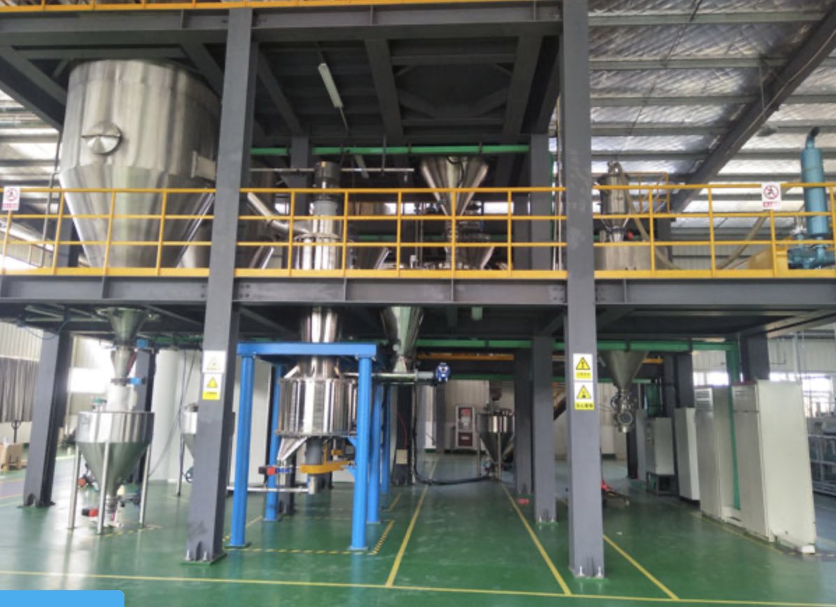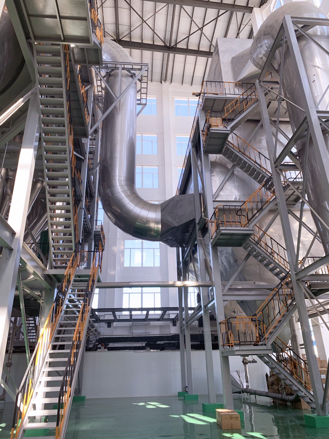 干燥噴霧系統用于噴霧干燥造粒,通過供料泵將研磨成品漿料輸送至干燥塔頂部霧化器。料液經干燥塔體頂部的高速離心霧化器,噴霧成極細微的霧狀液珠,與熱空氣并流接觸在極短的時間內干燥為成品,成品由脈沖布袋收集器收集,熱空氣由抽風機排空,并與新風進行熱交換,節省熱能。