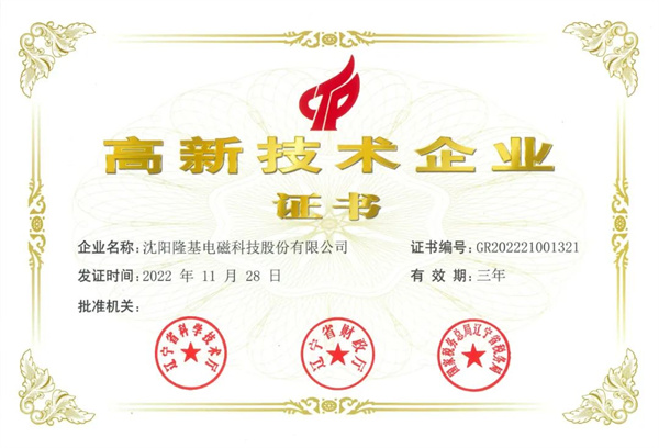 近日,隆基電磁再次獲得由遼寧省科學技術(shù)廳、遼寧省財政廳和國家稅務(wù)總局遼寧省稅務(wù)局聯(lián)合頒發(fā)的高新技術(shù)企業(yè)證書。