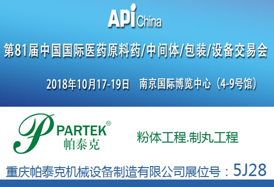 第81屆中國國際醫(yī)藥原料藥/中間體/包裝/設(shè)備交易會(API China)與第22屆中國國際醫(yī)藥(工業(yè))展覽會暨技術(shù)交流會將在南京國際博覽中心聯(lián)手展出。制劑、粉體工程專家—重慶帕泰克機(jī)械設(shè)備制造有限公司與來自國內(nèi)外的1000多家企業(yè)同臺競展。