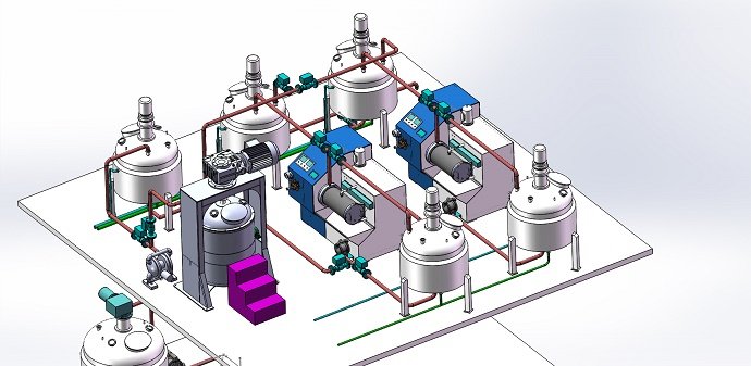 圖2 雙罐互倒細磨系統 工藝流程: 現場操作人員將物料投放至本系統中轉罐后;選擇工藝模式:單罐自循環/雙罐互倒,設定工藝參數:自循環時間/互倒次數;一鍵啟動本系統。系統根據選擇的工藝模式實現按照設定時間單罐自循環研磨/安裝設定互倒次數進行雙罐互倒研磨,完成后聲光報警提醒操作人員,雙罐互倒根據中轉罐內液位判斷是否倒罐。操作人員將研磨完成物料通過氣動隔膜泵投放至成品儲料罐。中轉罐及儲料罐攪拌電機由現場操作人員根據實際情況手動啟停。