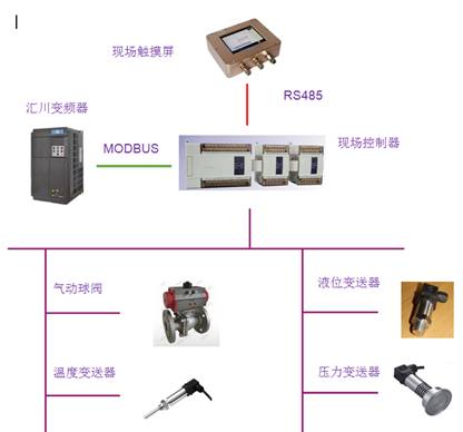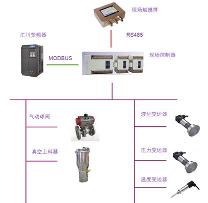 二、系統架構圖 本項目電氣控制分為四部分,包括1套自動上料及原料分散粗磨, 3套雙罐互倒細磨。 系統采用完全開放的標準網絡通信結構,具備三級分布式網絡架構,由現場觸摸屏、現場控制站及現場電機、閥門及儀器儀表構成,如圖1及圖2所示。系統實現工藝自動控制,系統控制指令及數據采集由現場觸摸屏完成,數據保存在SD卡中;現場控制站接收觸摸屏指令及現場儀表反饋信號進行邏輯運算及數據處理,并發送處理結果到現場執行機構(電機及閥門),實現工藝生產自動化。 1、自動上料及原料分散粗磨系統