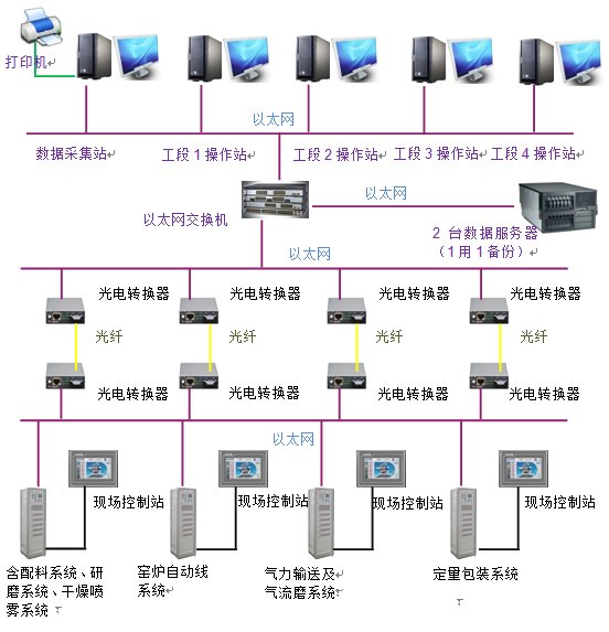 一、項目工藝流程 二、系統(tǒng)架構(gòu)圖 集中數(shù)據(jù)采集與監(jiān)控系統(tǒng)(SCADA系統(tǒng))是制造執(zhí)行系統(tǒng)(MES系統(tǒng))的一個最主要的子系統(tǒng),采用完全開放的標(biāo)準(zhǔn)網(wǎng)絡(luò)通信及三級分布式網(wǎng)絡(luò)架構(gòu),具備當(dāng)今最先進(jìn)的工業(yè)以太網(wǎng)和現(xiàn)場總線技術(shù),從現(xiàn)場各工段控制站采集實時生產(chǎn)數(shù)據(jù)實現(xiàn)集中顯示和數(shù)據(jù)歸檔,并實現(xiàn)對各工段工藝設(shè)備進(jìn)行回路控制、參數(shù)調(diào)節(jié)及信號報警,是生產(chǎn)管理不可缺少的工具。 SCADA系統(tǒng)著重提高生產(chǎn)管理效率,減輕管理人員負(fù)擔(dān),實現(xiàn)生產(chǎn)管理自動化與現(xiàn)代化。