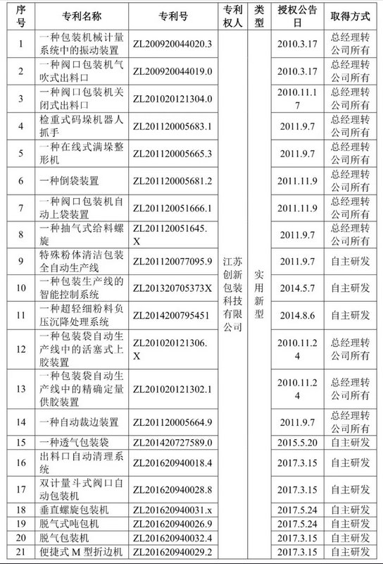 江蘇創新包裝科技有限公司2017年度獲得4項發明專利和6項實用型專利,使公司共擁有發明專利5項、實用型專利21項。這些專利的取得是公司重視科技研發、公司科技人員勤奮工作的結果。這些專利技術正逐步應用到產品中,使我公司智能包裝碼垛線、定量自動包裝機有更高的科技含量,不斷提高了公司產品的品質,受到了政府的獎勵、同行的肯定、客戶的歡迎。