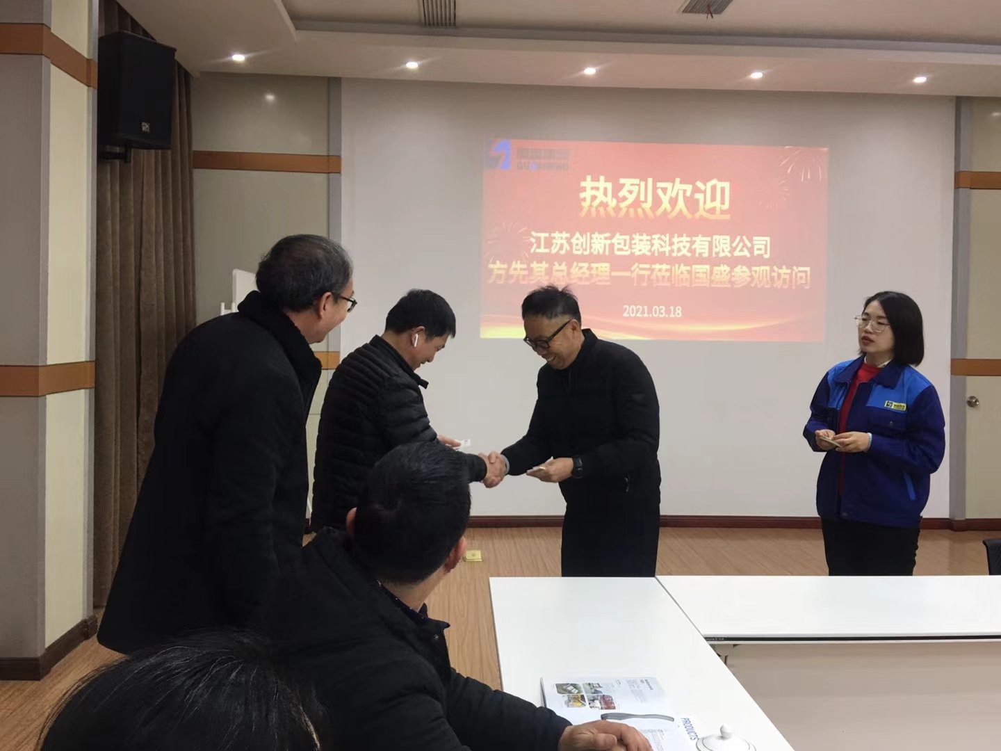 3月18日,江蘇創新包裝科技有限公司董事長方先其先生率領公司管理人員蒞臨南通國盛智能科技集團股份有限公司參觀訪問。南通國盛智能科技集團股份有限公司潘衛國董事長熱情地接待來訪一行。