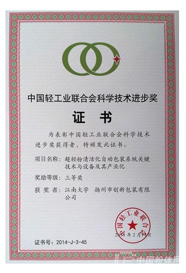 日前,由揚州市創(chuàng)新包裝有限公司、江南大學聯(lián)合承擔的超輕粉清潔化自動包裝系統(tǒng)關鍵技術與設備及其產(chǎn)業(yè)化項目獲得中國輕工業(yè)聯(lián)合會頒發(fā)的中國輕工業(yè)聯(lián)合會科學技術進步獎三等獎。