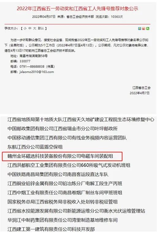 日前,從省總工會(huì)傳來(lái)喜訊,贛州金環(huán)磁選科技裝備股份有限公司電磁車間裝配組榮獲“2022年江西省工人先鋒號(hào)”榮譽(yù)稱號(hào)。