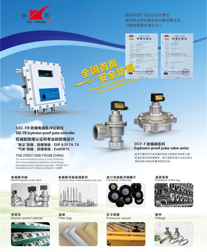 蘇州協昌環保科技股份有限公司(官網:www.xiechang.com),作為環保行業的重點企業,堅持“以人為本,科技創新”的方針,致力于袋式除塵器配件的研制、開發和制造,是袋式除塵首選品牌,江蘇省兩高企業(高新技術企業、高新技術產品),中國環保產業協會會員單位、袋式除塵委員會35家常委企業、16家副理事長單位之一,更是榮獲了:江蘇省袋式除塵系統工程技術中心。其袋式除塵產品廣泛應用于電力、冶金、建材、垃圾焚燒、化工等行業。蘇州協昌環保科技股份有限公司是加拿大沃森公司的中國大區總代理商。