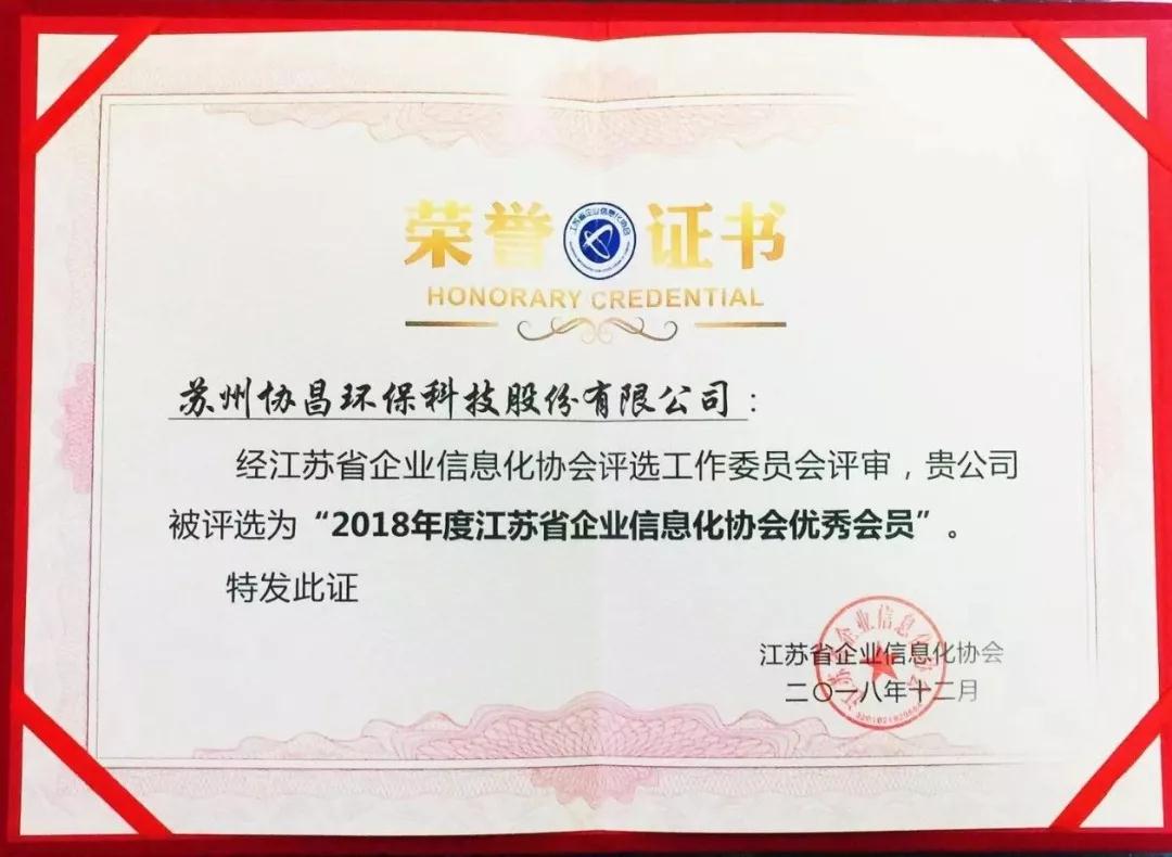 蘇州協昌環保科技股份有限公司參加了2018年江蘇省企業上云大會暨江蘇省企業信息化協會年會。年會由江蘇省工業和信息化廳指導,江蘇省企業信息化協會和江蘇省工業互聯網發展聯盟共同主辦的。會上,協昌環保被評為江蘇省企業信息化協會優秀會員。