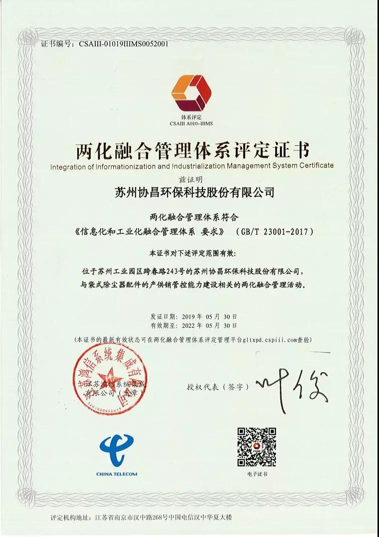 此次獲國家工信部頒發兩化融合管理體系評定證書,將進一步激勵蘇州協昌環保繼續大力推進兩化融合和創新發展戰略,內強管理、外拓市場、創新驅動、提質增效,不斷提升企業綜合競爭力和經營效益,為企業和行業發展進步將起到更大的促進作用。