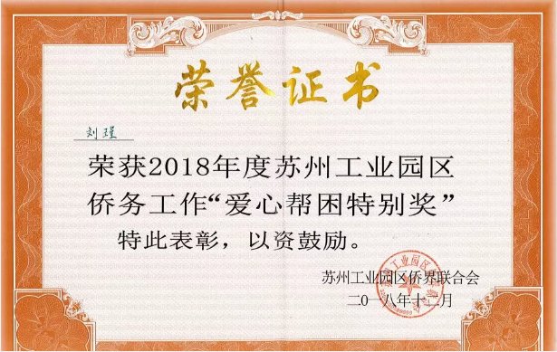 協(xié)昌環(huán)保總經(jīng)理劉瑾女士已經(jīng)多次參與工業(yè)園區(qū)相關(guān)的助學(xué)捐贈(zèng),履行了一名愛(ài)國(guó)的僑胞的大愛(ài)之心,也獲得相關(guān)部門(mén)和大家的交口稱贊,為此,在去年年底,蘇州工業(yè)園區(qū)僑界聯(lián)合會(huì)還特別頒發(fā)“愛(ài)心幫困特別獎(jiǎng)”作為對(duì)劉總的贊揚(yáng)和鼓勵(lì)。