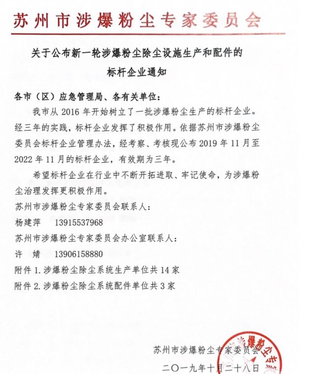 11月22--23日,蘇州市涉爆粉塵專家委員會第七次會議在蘇州陽澄喜柯國際酒店舉行。會上,專委會對涉爆粉塵除塵系統配件標桿企業進行表彰及授牌。