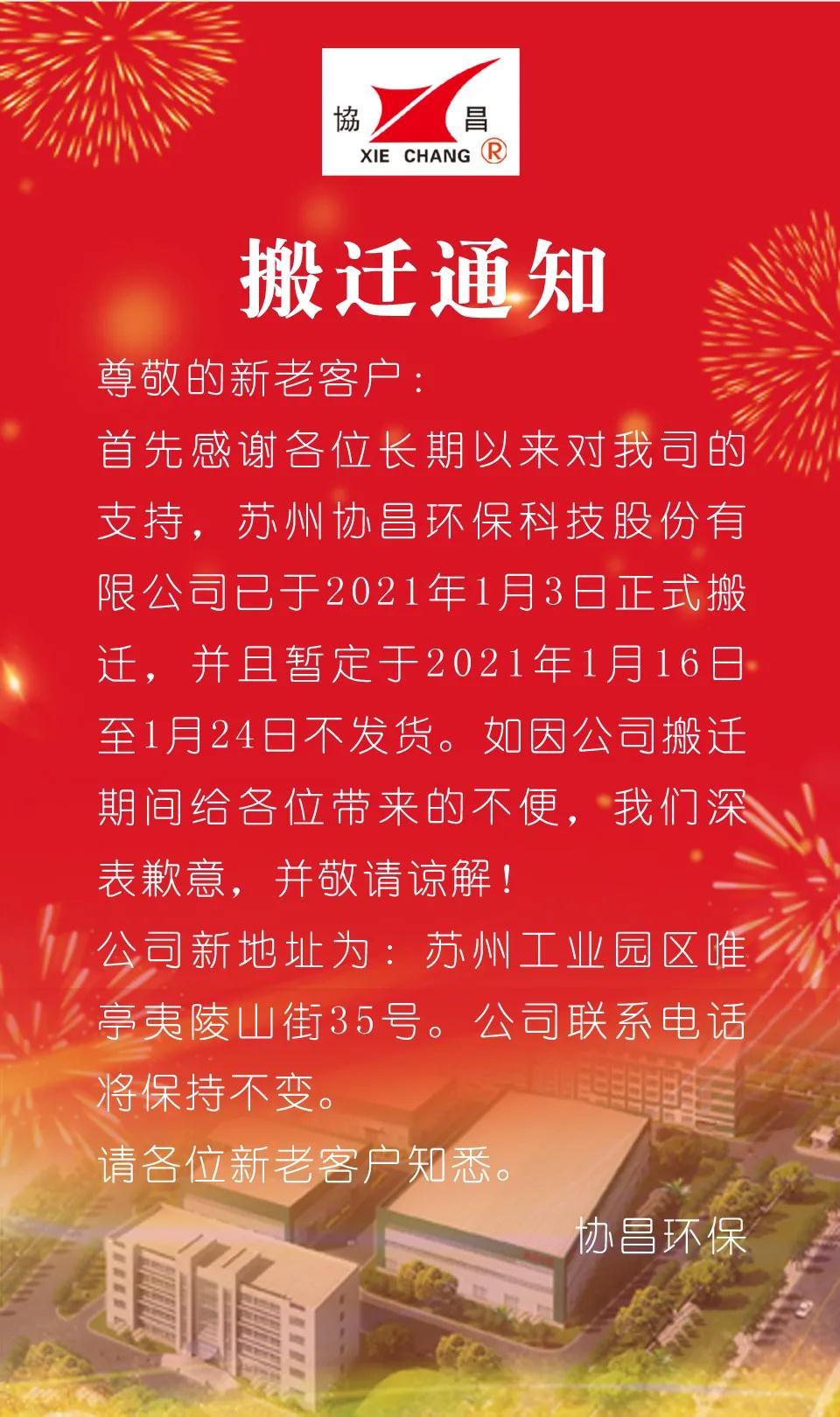 因業務發展需要,蘇州協昌環保科技股份有限公司已遷址蘇州市吳中區唯亭鎮夷陵山街35號