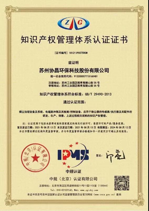 近日,蘇州協(xié)昌環(huán)保科技股份有限公司榮獲《知識(shí)產(chǎn)權(quán)管理體系認(rèn)證證書》,這表示協(xié)昌環(huán)保知識(shí)產(chǎn)權(quán)管理體系符合標(biāo)準(zhǔn):GB/T 29490-2013。煙塵治理設(shè)備及系統(tǒng)、電磁脈沖閥及其檢測(cè)/控制設(shè)備、應(yīng)用于除塵器的傳感器/執(zhí)行器及其配件的研發(fā)、生產(chǎn)、銷售、上述過(guò)程相關(guān)采購(gòu)的知識(shí)產(chǎn)權(quán)管理通過(guò)認(rèn)證。