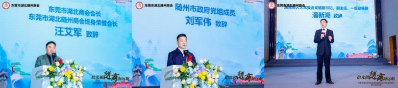 隨州東莞市湖北商會會長、東莞市隨州商會終生榮譽會長汪艾軍,來自隨州的家鄉領導——隨州市政府黨組成員劉軍偉,東莞市人大常委會黨組副書記、副主任、一級巡視員潘新潮等領導也上臺發表了致辭。