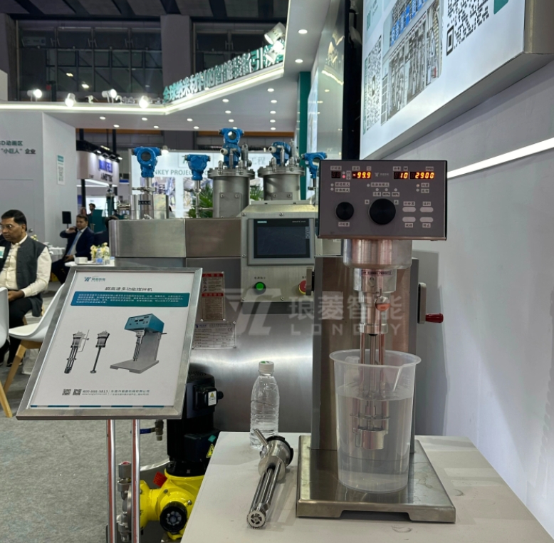 同時,在現場還一同展出了超高速多功能攪拌機,該機型是一種集乳化、分散功能于體的高端實驗裝置。具備豐富的攪拌頭可供選配,轉速高達20000r/min(轉速會因攪拌頭的不同而有所差異)。此外,該實驗機還具有正轉、反轉切換功能。可以應用于產品研發、檢驗原材料及驗證配方等。在這些強大的實驗型設備的助力下,學術設想不再受設備局限,為涂料技術革新筑牢根基。