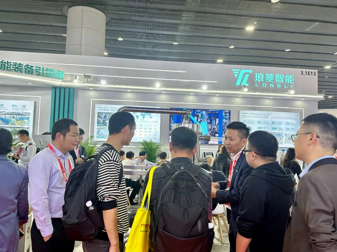 移步至EPC產線模型前,一比一等比例縮小的模型,精準把整個瑯菱智能產線展現在眼前,一臺臺先進設備依照合理的設計整齊排列,散發著工業科技的魅力。從前端投料到后端出料,讓客戶直觀洞察生產全貌,逼真的展示,引得大家紛紛圍觀。