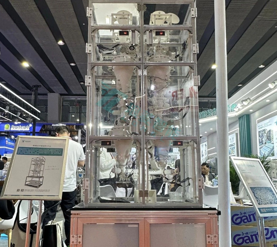 一同被圍觀的還有,首次在展會出道即大火的微縮全功能配料平臺,由瑯菱研發工程師全手工打造,模擬復現各項目的工藝生產過程,實現全流程邏輯功能測試,項目控制系統程序驗證。以往整個產線從儲料、配料到出料的整個產線龐大無比,為了照顧國內外的客戶,研發制作了微縮配料平臺,出道即巔峰。