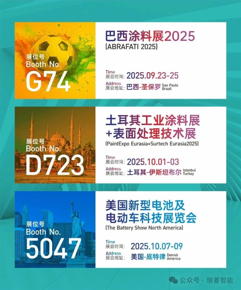 展會(huì)名稱:巴西圣保羅涂料展覽會(huì) 展位號(hào):瑯菱智能 ? 展位G74 日期:2025年9月23-25日 地點(diǎn):巴西圣保羅會(huì)展中心 2025年9月23-25日,巴西涂料展將于巴西圣保羅會(huì)展中心隆重舉辦。瑯菱智能將在展會(huì)G74展臺(tái)攜NT-V10L系列智能納米研磨系統(tǒng)驚艷亮相,為南美市場(chǎng)帶來(lái)智能裝備領(lǐng)域的創(chuàng)新解決方案,向世界展示中國(guó)高端智造的實(shí)力與魅力! 巴西涂料展,是南美洲具影響力的涂料裝備展和涂料原料展,也是南美洲規(guī)模最大、最具影響力的涂料專業(yè)展覽會(huì),展會(huì)面積和觀眾數(shù)量不僅在南美首屈一指,而且在全球涂料行業(yè)中也名列前茅,是中國(guó)涂料企業(yè)進(jìn)軍南美洲最佳貿(mào)易平臺(tái)。 ▲ 納米砂磨機(jī) NT-V 10L 展會(huì)現(xiàn)場(chǎng),明星展品NT-V10L系列亮點(diǎn)包括智能核心升級(jí)、精度突破創(chuàng)新、智能運(yùn)維革新。技術(shù)人員每日技術(shù)講座,深度解讀展品NT-V10L系列技術(shù)創(chuàng)新;瑯菱技術(shù)團(tuán)隊(duì)實(shí)地操作展示,直觀體驗(yàn)設(shè)備性能,現(xiàn)場(chǎng)解惑。 展會(huì)名稱:2025土耳其工業(yè)涂料展+表面處理技術(shù)展 展位號(hào):瑯菱智能 ? 展位D723 日期:2025年10月1-3日 10月1-3日,第八屆國(guó)際工業(yè)涂料技術(shù)博覽會(huì)將于土耳其伊斯坦布爾國(guó)際會(huì)展中心隆重舉辦。瑯菱智能將在展會(huì)D723展臺(tái)精彩亮相,重點(diǎn)展示針對(duì)涂料行業(yè)的一站式解決方案。 土耳其不僅是歐亞大陸的重要樞紐,更是中東地區(qū)涂料市場(chǎng)的核心之一。其涂料市場(chǎng)規(guī)模已突破20億美元,并保持強(qiáng)勁增長(zhǎng)勢(shì)頭。隨著汽車、建筑等行業(yè)迅速發(fā)展和環(huán)保需求提升,土耳其正快速向水基涂料等環(huán)保型技術(shù)轉(zhuǎn)型,為高端涂料設(shè)備帶來(lái)巨大機(jī)遇。本次展會(huì)也因此成為全球行業(yè)目光的焦點(diǎn)。 ▲ 涂料產(chǎn)線模型圖 本屆展會(huì)規(guī)模空前,預(yù)計(jì)迎來(lái)超多的專業(yè)觀眾、1000+行業(yè)品牌、40+國(guó)家和地區(qū)代表共話前沿技術(shù)。瑯菱智能將帶來(lái)針對(duì)涂料行業(yè)的高端研磨解決方案,現(xiàn)場(chǎng)我們的技術(shù)團(tuán)隊(duì)還將為您帶來(lái)定制專屬技術(shù)方案,解決生產(chǎn)痛點(diǎn)、優(yōu)化效益,提供面對(duì)面咨詢服務(wù)。 展會(huì)名稱:2025美國(guó)新型電池及電動(dòng)車科技展覽會(huì) 展位號(hào):瑯菱智能 ? 展位5047 日期:2025年10月7-9日 10月7-9日,全球新能源行業(yè)盛會(huì)——美國(guó)新型電池及電動(dòng)車科技展覽會(huì)將于底特律舉行,瑯菱智能將在展會(huì)5047展臺(tái)精彩亮相,并展示技術(shù)成果:NT-V2L系列及磷酸鐵鋰電池模型,面向世界舞臺(tái)展現(xiàn)在新能源領(lǐng)域的創(chuàng)新實(shí)力。 這個(gè)展覽會(huì)是北美先進(jìn)的電池技術(shù)及電動(dòng)車科技盛會(huì),匯集了10,000多名工程師和管理人員以及700多家供應(yīng)商,全面展示電動(dòng)和混合動(dòng)力汽車的先進(jìn)電池以及關(guān)鍵電源技術(shù),將成為新能源領(lǐng)域研發(fā)成果和前沿解決方案的展示舞臺(tái)。 ▲ 納米砂磨機(jī) NT-V 2L 作為一家專注于新能源智能裝備與系統(tǒng)解決方案的企業(yè),瑯菱智能始終致力于推動(dòng)電池技術(shù)的發(fā)展和電動(dòng)車產(chǎn)業(yè)的升級(jí)。本次參展,瑯菱智能將重點(diǎn)呈現(xiàn)NT-V2L系列以及磷酸鐵鋰電池方案,并且現(xiàn)場(chǎng)提供設(shè)備運(yùn)行動(dòng)態(tài)演示及技術(shù)團(tuán)隊(duì)深度講解,我們始終秉持“讓好裝備成為您企業(yè)的核心競(jìng)爭(zhēng)力”,期待為全球客戶創(chuàng)造更多價(jià)值! 歡迎各位行業(yè)伙伴、媒體朋友及專業(yè)人士蒞臨瑯菱智能展位交流洽談,共同探索更多可能性!01 巴西