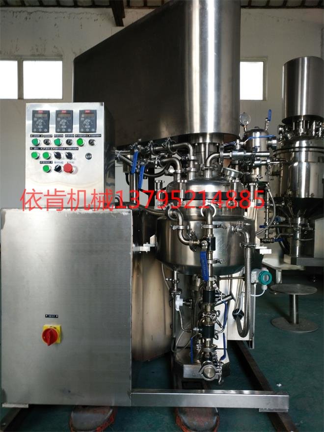 物料通過(guò)乳化鍋內(nèi)上部的中心攪拌、聚四氟乙烯刮板始終迎合攪拌鍋形體,掃凈掛壁粘料,使被刮取的物料不斷產(chǎn)生新界面,再經(jīng)過(guò)葉片與回轉(zhuǎn)葉片的剪斷、壓縮、折疊,使其攪拌、混合而向下流往鍋體下方的均質(zhì)機(jī)處,物料再通過(guò)高速旋轉(zhuǎn)的切割輪與固定的切割套之間所產(chǎn)生的強(qiáng)力的剪斷、沖擊、亂流等過(guò)程,物料在剪切縫中被切割,迅速破碎成200nm-2um的微粒,由于乳化罐內(nèi)處于真空狀態(tài),物料在攪拌過(guò)程中產(chǎn)生的氣泡被及時(shí)抽走。采用抽真空的方式,使所生產(chǎn)的制品在攪拌過(guò)程中不再混入氣泡,從而保證可制造出富有光澤、細(xì)膩及延展性良好的優(yōu)質(zhì)產(chǎn)品