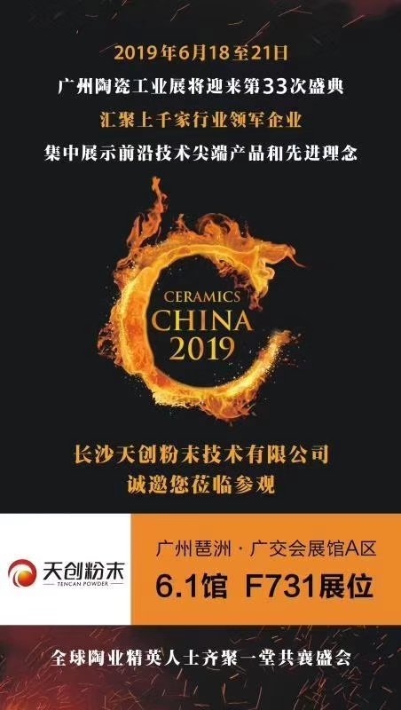Ceramics China 2019第33屆廣州陶瓷工業(yè)展定于6月18-21日在廣州廣交會展館A區(qū)舉行。粉體設(shè)備制造商-長沙天創(chuàng)粉末技術(shù)有限公司應(yīng)邀參加,天創(chuàng)粉末與您相約廣州廣交會展館6.1館,F731展位。