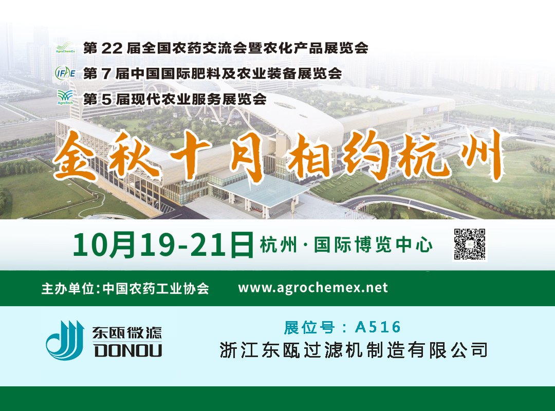 第二十二屆全國農藥交流會暨農化產品展覽會(ACE)第五屆現代農業服務展覽會(AgroTech)將于2022年10月19-21日在杭州國際博覽中心舉辦。東甌過濾在A516展位等您!