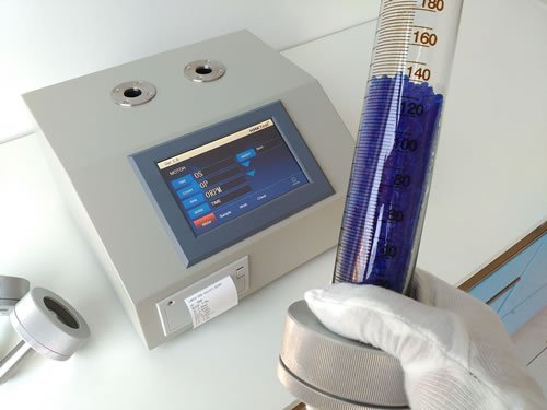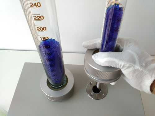 視松裝密度簡稱視密度,一般通過漏斗法來進行測量的。對于粉末不施加任何外力,單靠重力的作用使其自由流動到一定規(guī)格的漏斗中,經(jīng)過漏斗孔后,粉末自由流動到量杯中(一般不帶刻度,但是體積是已知的),待流動完成后刮平杯口,用粉末的質(zhì)量除以體積就得出該粉末的視松裝密度。建議使用匯美科LABULK系列松裝密度儀(包括振實密度儀),全部都是經(jīng)過國際標準進行標定的,測量結(jié)果具有追溯性。對于不同行業(yè),配有不同的松裝密度儀。