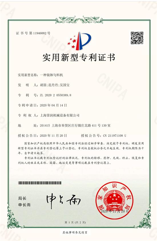 近日,我司新增一項實用新型專利證書——一種裝缽勻料機實用新型專利。